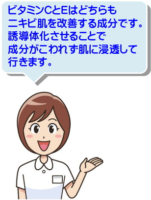 これにより、ビタミンC誘導体とビタミンE誘導体のW力が高まり、ニキビ肌解消へと導きます。